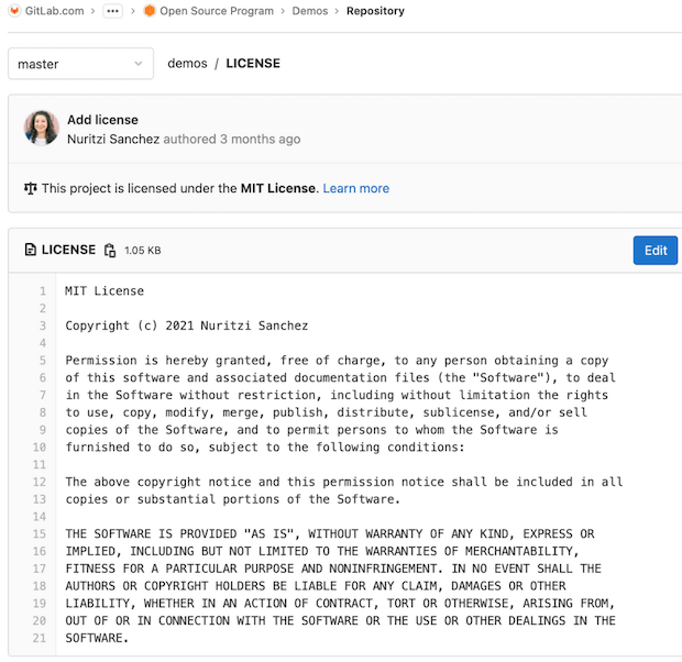 To meet GitLab for Open Source Program requirements, first add an OSI-approved open source license to all projects in your namespace.