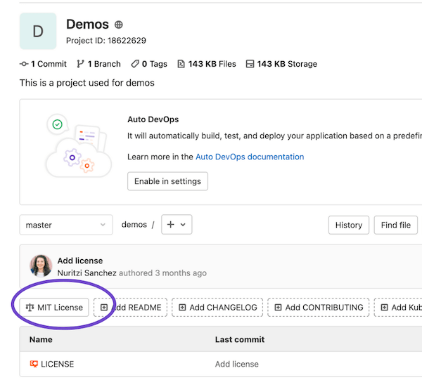 Applicants must add the correct license to each project in their respective groups or namespaces. When you're sure you're using OSI-approved licenses for your projects, you can take your screenshots.